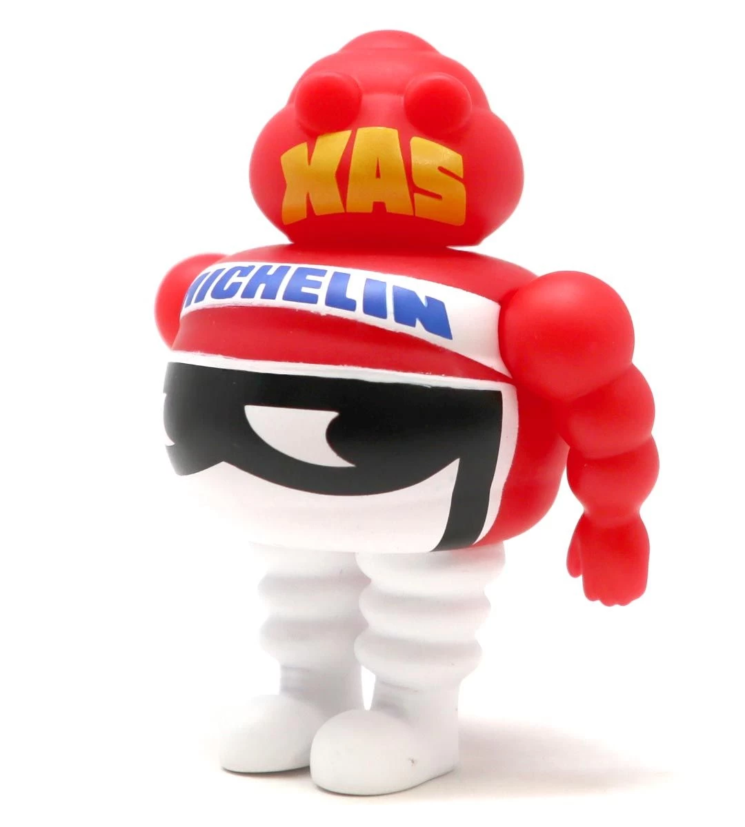 Depuis son lancement en 1965 jusqu’à la fin des années 70, le pneu MICHELIN X Asymétrique, appelé XAS, est un concentré d’innovation. Cette figurine de la publicité de l’époque porte le célèbre casque à visière et ses trois couleurs et témoigne de l’esprit sportif et conquérant de Michelin, parfaitement mis en valeur en all over sur Bibendum.
