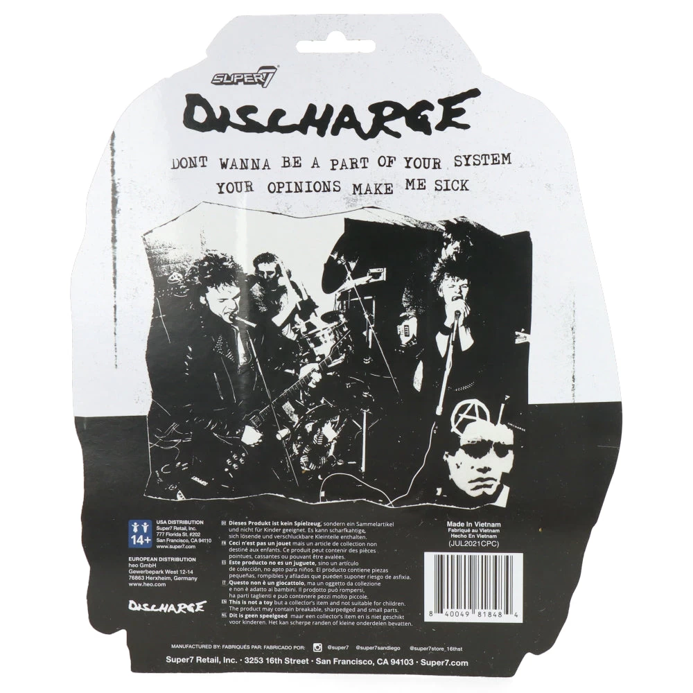 Nous retrouvons ici la veste en cuir cloutée emblématique du single « Realities of War » de Discharge en 1980. Cette figurine articulée de 3,75″ (9,5cm) représente Cal avec ses cheveux à pointes et son microphone. Avis aux fans de hardcore, ne ratez pas l’occasion de l’ajouter à votre collection !