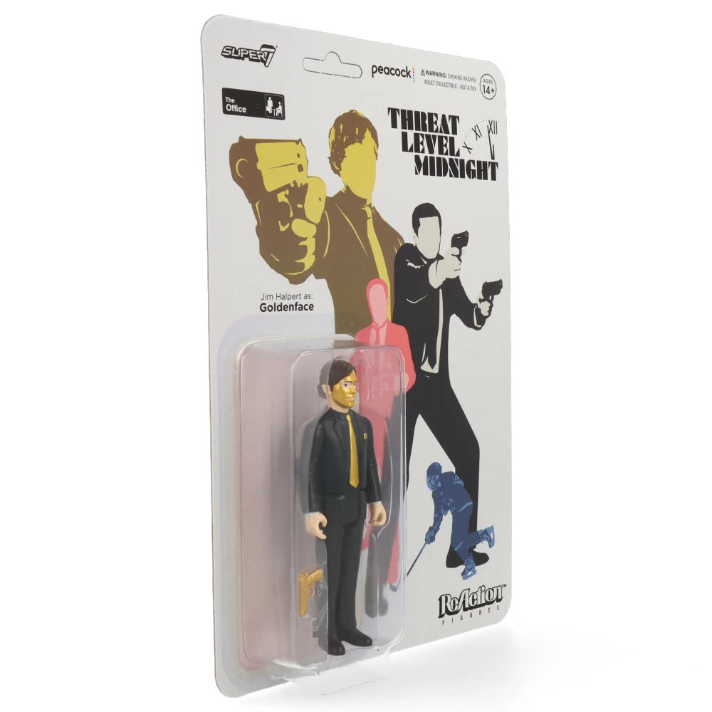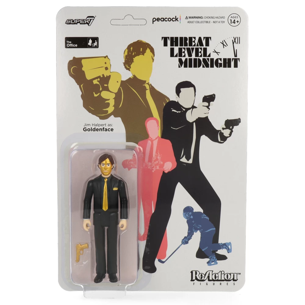 Dans la collection The Office de ReAction Figure, nous retrouvons ici Jim Halpert dans le rĂ´le de Goldenface, personnage inspirĂ© du film de Michael Scott « Threat Level Midnight ». Goldenface travaillait dans une usine d’or mais son patron ne se souciait que de l’argent et ne prĂ©voyait pas de pauses dĂ©jeuner, il devait manger alors manger de l’or !